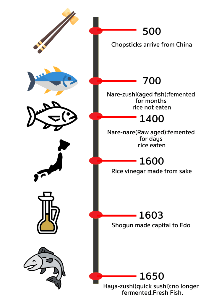 The history of sushi began with Paddy Fields in Asia, where fish was fermented with rice vinegar after which the rice was discarded. The dish is today known as narezushi In the Muromachi period, people began to eat the rice as well as the fish. During the Edo period, vinegar rather than fermented rice began to be used.